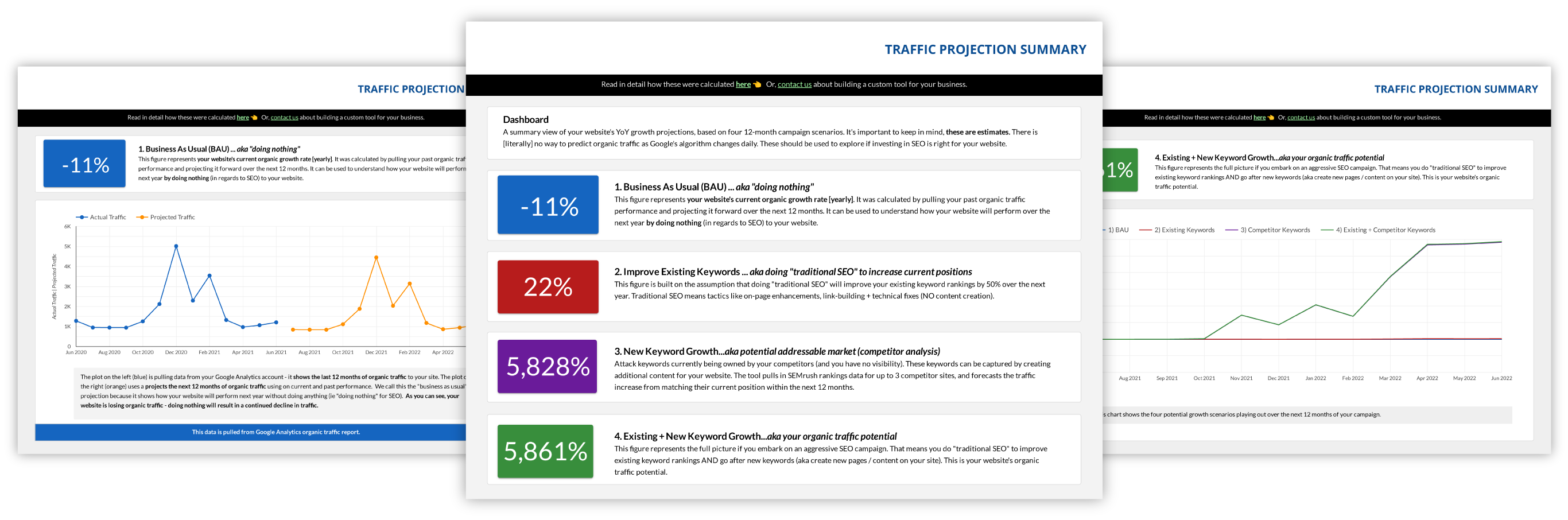 We pull data from Google Search Console, Google Analytics + SEMrush to understand your website's current performance. We then scrape competitor keywords to understand Addressable Market potential. We then run a number of formulas to show your website's organic potential, and the impact of that traffic on your leads / sales.